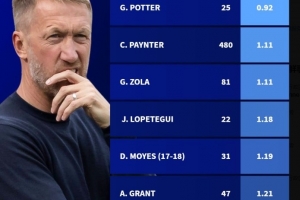 全文摘要:英超第5輪,西漢姆聯(lián)主場(chǎng)1-2不敵水晶宮,主帥格拉漢姆·波特遭遇下課危機(jī)。據(jù)統(tǒng)計(jì),波特成為隊(duì)史拿分率最低的主帥,25場(chǎng)場(chǎng)均僅0.92分,排名隊(duì)史墊底,執(zhí)教前景堪憂(yōu)。