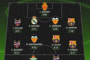 體育資訊9月22日訊 西甲第五輪戰(zhàn)罷,數(shù)據(jù)網(wǎng)站W(wǎng)hoscored也評(píng)選出本輪西甲最佳陣,費(fèi)蘭等巴薩3人在列,米利唐如選。以下為具體陣容: