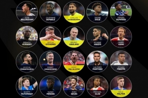 登貝萊(巴黎)、哈蘭德(曼城)、若奧-內(nèi)維斯(巴黎)、貝林厄姆(皇馬)、萊萬(巴薩)