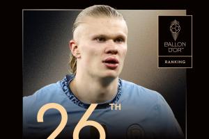 曼城前鋒哈蘭德排名第26名,這是他第五次獲得提名,哈蘭德生涯最高排名為2023年的第二名。