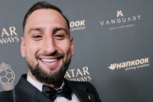 獲獎后,多納魯馬非常開心,手捧獎杯自拍。曼城官方曬出這一照片,慶祝多納魯馬獲獎。