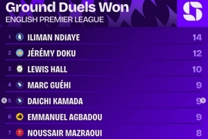全文摘要:英超第5輪數(shù)據(jù)排行出爐,埃弗頓邊鋒恩迪亞耶以14次贏得地面對抗次數(shù)高居榜首。曼城的多庫以12次位列第二,紐卡的劉易斯-霍爾以10次排名第三。水晶宮的格伊、鐮田大地以及狼隊(duì)的阿格巴杜均以9次并列第四。