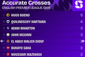 英超第5輪精準(zhǔn)傳中榜: