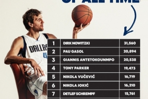 NBA歐洲官方賬號(hào)曬出歐洲球員得分前十,具體如下: