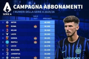 體育資訊9月25日訊 2025-26賽季意甲各隊(duì)季票銷售數(shù)量榜出爐,其中國米、羅馬4萬張并列第一。