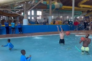 兩人在泳池進(jìn)行投籃PK,為Boys & Girls Club of Greater Houston俱樂(lè)部籌集了1萬(wàn)美元的善款。