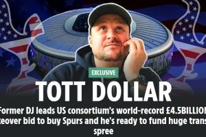 體育資訊09月26日訊 太陽報獨(dú)家報道,一家美國財團(tuán)計劃以創(chuàng)世界紀(jì)錄的45億英鎊總報價買托特納姆熱刺。