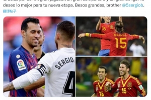 體育資訊9月26日訊 西班牙中場布斯克茨宣布賽季結束后退役,拉莫斯社媒發(fā)文,為他送上祝福。