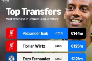 體育資訊9月2日訊 利物浦已經(jīng)官宣簽下伊薩克。數(shù)據(jù)統(tǒng)計(jì)顯示,英超歷史最貴轉(zhuǎn)會(huì)前6名均發(fā)生在最近4年,而紅軍在今夏兩次刷新了英超歷史標(biāo)王紀(jì)錄。