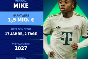 體育資訊9月28日訊 在本輪德甲拜仁4-0大勝不萊梅的比賽中,17歲小將麥克替補登場迎來一線隊首秀。