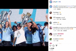 哈蘭德曬出他與埃德森三冠王賽季共同慶祝的合照,并配文:“一位絕對的傳奇人物@埃德森!謝謝你的一切,尤其是你的助攻????(你的表情符號,總是如此??)”