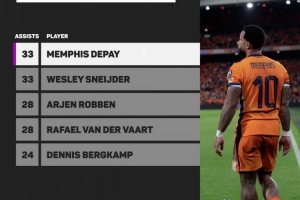 全文摘要:在世預(yù)賽中,荷蘭隊1-1戰(zhàn)平波蘭,德佩送出助攻。此助攻使他追平了斯內(nèi)德,并列自1978年世界杯以來荷蘭隊歷史助攻榜首位,兩人均貢獻(xiàn)33次助攻。
