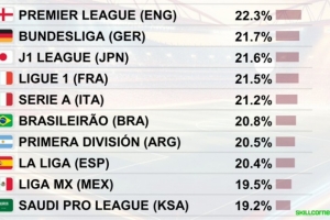 全文摘要:根據CIES數據,英超以22.3%的高速跑動距離占比位居全球聯賽榜首,展現最高強度的比賽節(jié)奏。德甲(21.7%)與J聯賽(21.6%)分列二、三位,而西甲僅排名第八(20.4%),凸顯其風格差異。