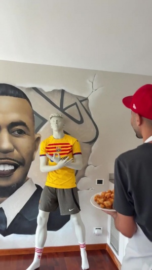 在視頻的最后,鏡頭賺到房間的一面墻,那里擺著一個亞馬爾標志性慶祝動作的模型,亞馬爾的父親拿著雞塊說:“嘿,拉明,你還好嗎?我特別愛你,孩子,爸爸愛你。我給你準備了驚喜,小可愛。等會兒給你戴上,咱就給大伙兒瞧瞧。我愛你?!?/p>