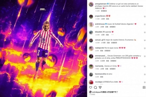本場比賽格列茲曼打進(jìn)一球,達(dá)成馬競生涯200粒進(jìn)球里程碑。賽后他也在個人社媒曬出海報,寫道:“身披這件球衣慶祝進(jìn)球是一種榮幸,而能夠200次做到這一點(diǎn)則是夢想成真。感謝所有球迷!”
