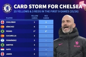 體育資訊10月1日訊 德國(guó)轉(zhuǎn)會(huì)市場(chǎng)統(tǒng)計(jì),切爾西新賽季前9場(chǎng)比賽,領(lǐng)到25張黃牌和3張紅牌。