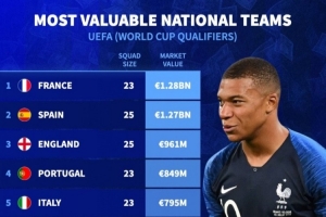 德轉(zhuǎn)列歐洲國家隊(duì)身價榜:歐元