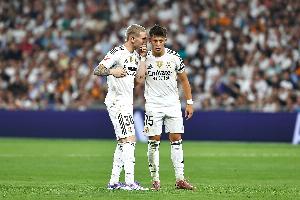在居勒爾的身邊,馬斯坦托諾也強(qiáng)勢崛起,他成熟的競技狀態(tài)和極具感染力的個性令所有人感到驚訝。馬斯坦托諾的比賽風(fēng)格充滿斗志與激情,同時也展現(xiàn)出穩(wěn)定的天賦。他為阿隆索提供了源源不斷的活力,因?yàn)樗偸堑谝粋€發(fā)起逼搶,在右路不知疲倦的奔跑,把這股能量傳遞給隊友,同時還有突破和制造威脅的能力。如果說居勒爾代表著節(jié)奏掌控、創(chuàng)造力和天生的才華,那么馬斯坦托諾則是著力量、投入和激情的化身。當(dāng)兩人同時在場時,皇馬的整體明顯更加平衡。