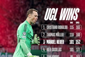 拜仁官方曬出了球員歐冠勝場排名,諾伊爾取勝101場與卡西并列歷史第三多,僅少于C羅和穆勒。