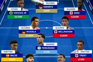 前鋒:維尼修斯(1.7億歐)、哈弗茨(6500萬歐)、薩卡(1.5億歐)