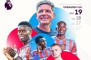 據(jù)英超官方統(tǒng)計,水晶宮各賽事19場不敗,創(chuàng)造隊史最長不敗紀錄。