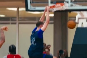 訓練當中,濃眉持球背轉(zhuǎn)身遭遇兩人包夾,與弗拉格打出精妙高低位配合,后者得球暴扣終結(jié)。