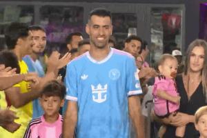 美職聯(lián)邁阿密4-1新英格蘭革命賽后,布斯克茨帶著妻子和三個孩子參加退役儀式。