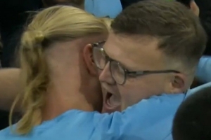 曼城官方社媒曬出視頻,哈蘭德賽后將球衣贈送給一名球迷,后者與哈蘭德?lián)肀В⒂H吻了他的臉頰。