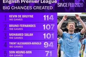 全文摘要:根據(jù)Squakwa統(tǒng)計,自2020年2月以來,B費在英超創(chuàng)造重大機(jī)會次數(shù)達(dá)107次,在198場比賽中排名第二,僅次于德布勞內(nèi)的114次。薩拉赫以101次位列第三,展現(xiàn)了B費在曼聯(lián)的進(jìn)攻核心作用。