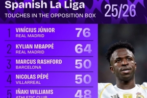 體育資訊10月7日訊 日前,Squawka統(tǒng)計了本賽季西甲禁區(qū)觸球次數(shù)排行,維尼修斯76次居首,姆巴佩64次第二。