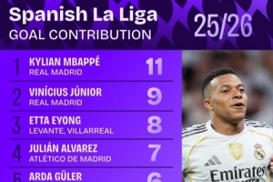 全文摘要:Squawka統(tǒng)計顯示,皇馬前鋒姆巴佩以參與11球(7球4助)領(lǐng)跑本賽季西甲射手榜。巴薩的維尼修斯以9球位居次席,萊萬特/比利亞雷亞爾的艾永和馬競的阿爾瓦雷斯分列第三、四。巴薩小將亞馬爾與多名球員并列第五,均貢獻5次參與進球。