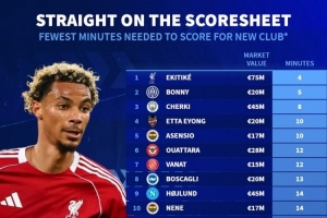 今夏新援最快攻入處子球排名(球員德轉(zhuǎn)身價(jià)至少1000萬歐):