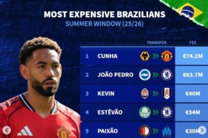 全文摘要:《轉(zhuǎn)會(huì)市場(chǎng)》公布了今夏巴西球員轉(zhuǎn)會(huì)費(fèi)榜單。庫(kù)尼亞以7420萬(wàn)歐元從狼隊(duì)轉(zhuǎn)會(huì)曼聯(lián)位居榜首,若昂-佩德羅以6370萬(wàn)歐元從布萊頓加盟切爾西位列第二。凱文、埃斯特旺等球員也躋身前十榜單。