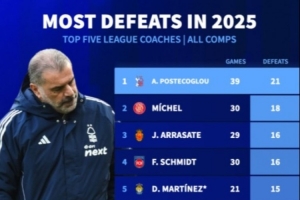 以下為五大聯(lián)賽主教練2025年輸球場(chǎng)次排行: