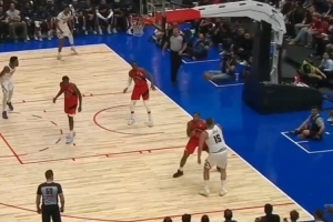 當(dāng)時(shí)約基奇被打,轉(zhuǎn)身之后底線一端單臂大掄傳將球送給另一端的卡梅隆-約翰遜,但后者三分沒(méi)能命中。