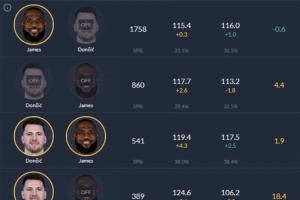 詹姆斯、東契奇同場(chǎng)時(shí),凈效率+1.9