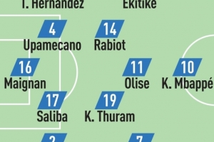 隊(duì)報(bào)預(yù)測法國隊(duì)首發(fā):邁尼昂;特奧、于帕梅卡諾、薩利巴、古斯托;拉比奧特、K-圖拉姆、?;倏恕W利塞、科曼;姆巴佩
