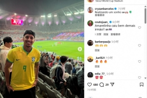克雷桑身著印有自己名字的巴西9號(hào)球衣親臨現(xiàn)場(chǎng),觀看了巴西隊(duì)與韓國(guó)隊(duì)的比賽。