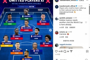 體育資訊10月11日訊 德轉(zhuǎn)列出落選本期國家隊的最貴陣容,總價高達6.77億歐。