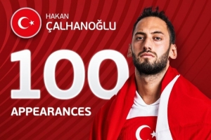 恰爾汗奧盧達(dá)成土耳其國家隊(duì)100場里程碑,期間累計(jì)貢獻(xiàn)21粒進(jìn)球與18次助攻。