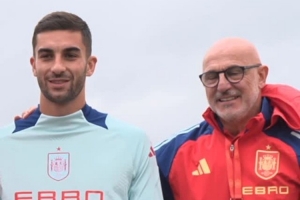 費(fèi)蘭-托雷斯達(dá)成為西班牙隊(duì)出戰(zhàn)50場(chǎng)比賽里程碑,西班牙隊(duì)昨日訓(xùn)練之前向他頒發(fā)了50場(chǎng)紀(jì)念球衣,全隊(duì)與費(fèi)蘭合影表示祝賀。