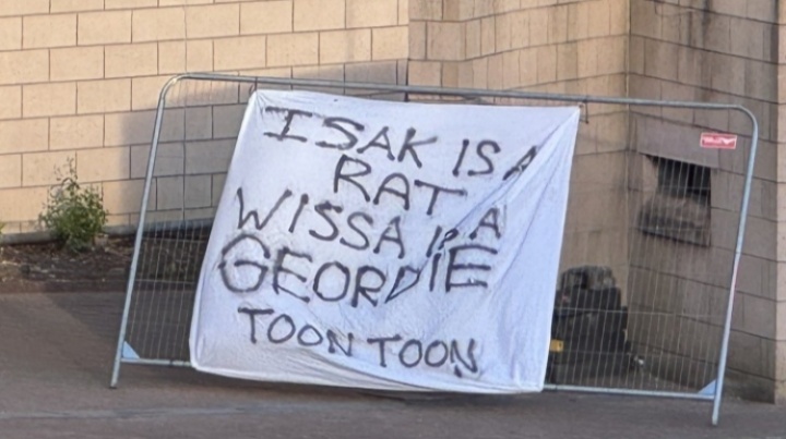 標語上寫著,Isak is a rat, Wissa is a Geordie, Toon Toon.(翻譯參考:伊薩克是叛徒,維薩是自家人,紐卡!紐卡!)