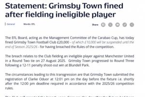 違規(guī)事件涉及俱樂部在2025年8月27日第二輪比賽中對陣曼聯(lián)時(shí),使用了一名不符合資格的球員。格林斯比鎮(zhèn)在布倫德爾公園以12-11的點(diǎn)球大戰(zhàn)獲勝,晉級(jí)第三輪。