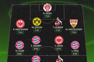 后衛(wèi):R-克里斯滕森(法蘭克福,7.61分)、安東(多特,7.41分)、蒂莫-許伯斯(科隆,7.19分)、米特爾施塔特(斯圖加特,7.34分)