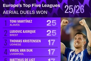 體育資訊9月12日訊 Squawka統(tǒng)計(jì)了本賽季球員在五大聯(lián)賽的爭頂成功次數(shù),并列出榜單。