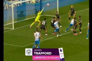 英超第3輪,曼城客戰(zhàn)布萊頓,此役第88分鐘,布萊頓右側(cè)角球機(jī)會(huì),小禁區(qū)線范赫克的攻門被特拉福德?lián)醭觥?/p>
