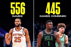 美媒Clutchpoints曬圖,布里奇斯生涯出場556次,錫安和三球加起來445次。