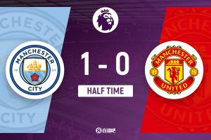 上半場補(bǔ)時(shí)1分鐘,曼城1-0曼聯(lián)。