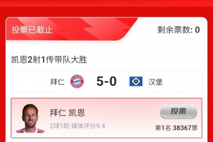 第三輪評(píng)選結(jié)果結(jié)出爐,凱恩2射1傳,幫助拜仁5-0大勝漢堡,獲得吧友近4萬(wàn)票的支持,擊敗格里馬爾多當(dāng)選 【體育資訊X小紅書(shū)德甲第3輪最佳球員】!