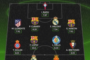 體育資訊9月16日訊 本輪西甲戰(zhàn)罷,數(shù)據(jù)網(wǎng)站W(wǎng)hoscored也評出本輪西甲最佳陣,具體如下: